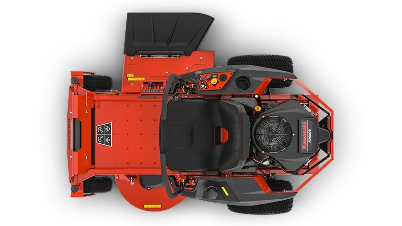 Equipped with a Kawasaki FR600V 18HP or FR651V 21.5HP engine, depending on the model's deck size.